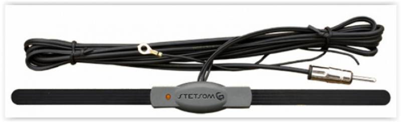 Antena universal interna de pára-brisa amplificada ,com cabo de 2,5 m da antena até o rádio , com led vermelho e conexão plug DIN ,para rádios convencionais.